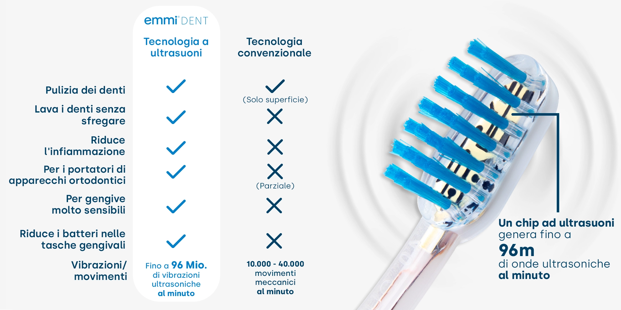 La differenza fondamentale rispetto agli altri spazzolini da denti sta nel tipo di pulizia: mentre gli spazzolini elettrici rotanti e quelli sonici funzionano meccanicamente e quindi puliscono solo le zone che riescono a raggiungere fisicamente, lo spazzolino a ultrasuoni di emmi-dent offre una pulizia completa dell'intera cavità orale. E tutto questo avviene senza alcuna pressione, il che consente una cura delicata e approfondita, delicata sulle gengive e adatta anche ai denti sensibili.