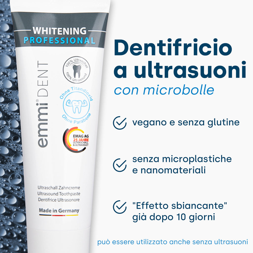 Emmi-dent Platinum utilizza uno speciale dentifricio a ultrasuoni che contiene le microbolle necessarie, circa 1000 volte più piccole delle normali bolle del dentifricio. Queste microbolle vengono aggiunte in un ulteriore passaggio del processo di produzione per garantire un'esperienza di pulizia ottimale: scopri qui lo studio sulla loro esistenza. Prendiamo in considerazione le cinque diverse opzioni di dentifricio disponibili per emmi-dent e i rispettivi vantaggi e caratteristiche.