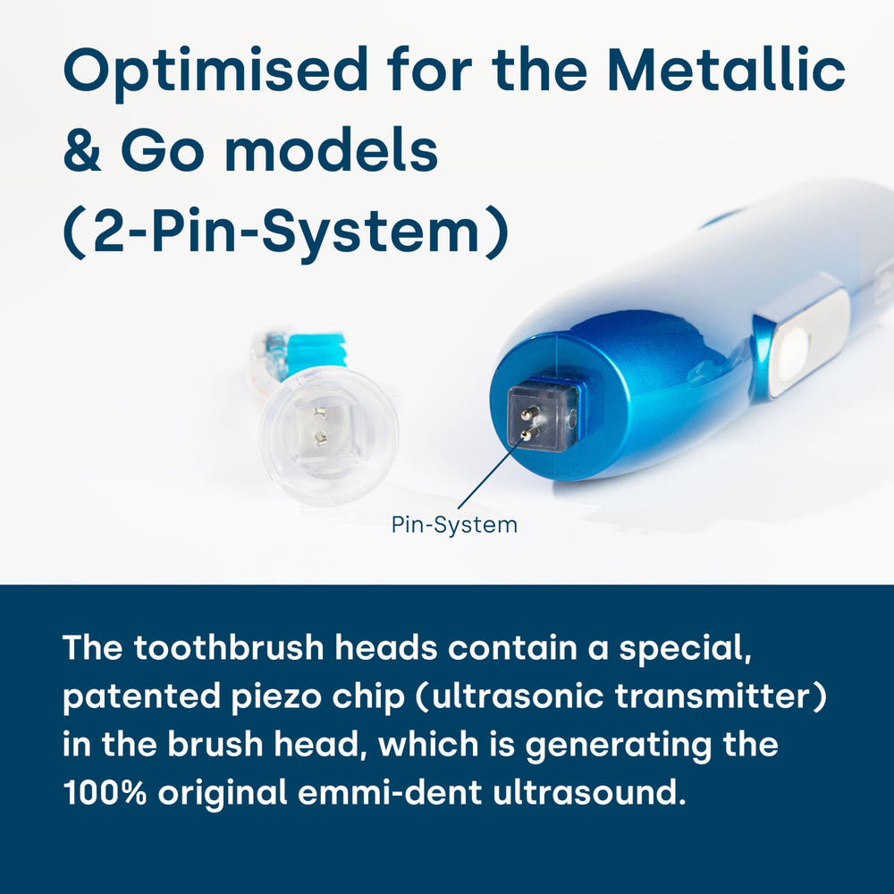 Please note that the ultrasonic brush heads of the emmi-dent Metallic and Go can only be used for tooth cleaning and oral hygiene with the emmi-dent Metallic & GO model.
