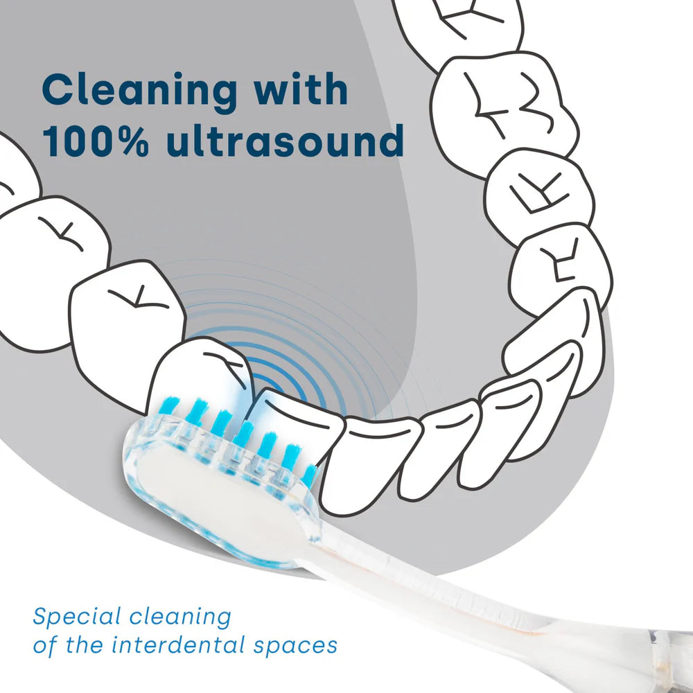 - Thorough cleaning: Ultrasonic technology removes plaque and bacteria without mechanical brushing.