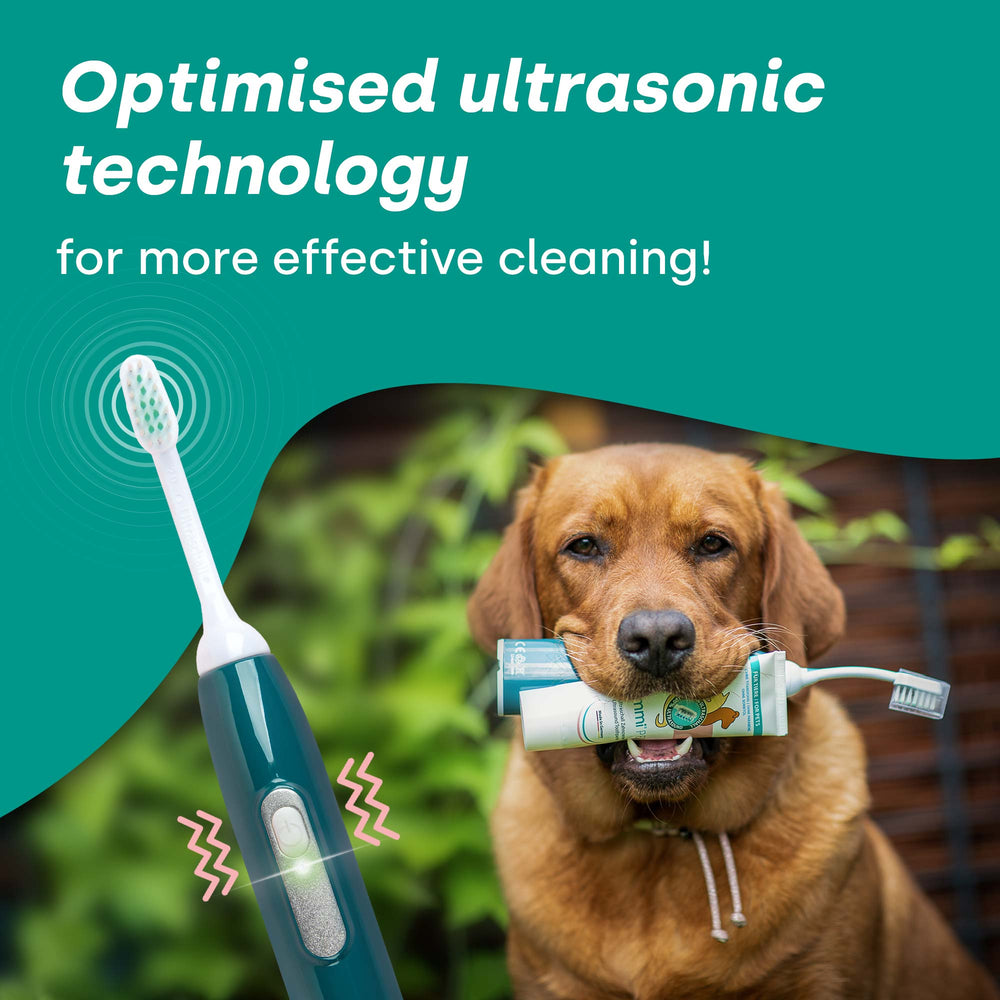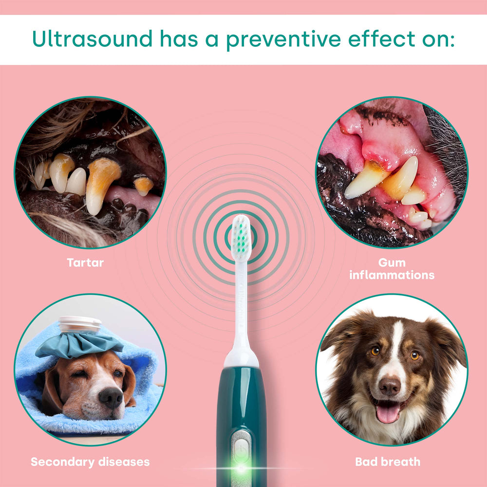 The improved ultrasonic toothbrush not only thoroughly removes plaque and biofilm, but also reduces gingivitis and strengthens your pet's gums for the long term. Thanks to the optimized technology, cleaning is even more effective - and all without scrubbing.