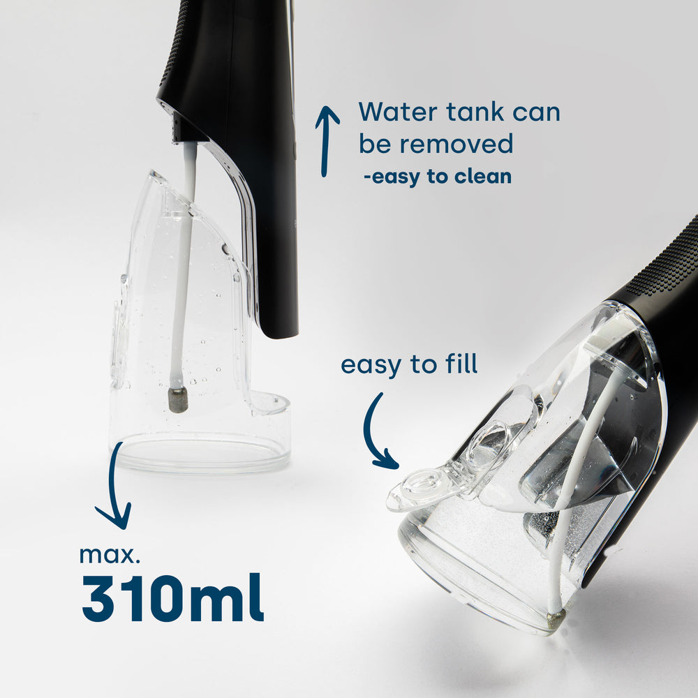 The oral irrigator is waterproof according to IPX7 and can be used at home or when travelling. The integrated 300 ml tank can be easily removed for cleaning. The nozzle can also be easily removed to change the attachments.