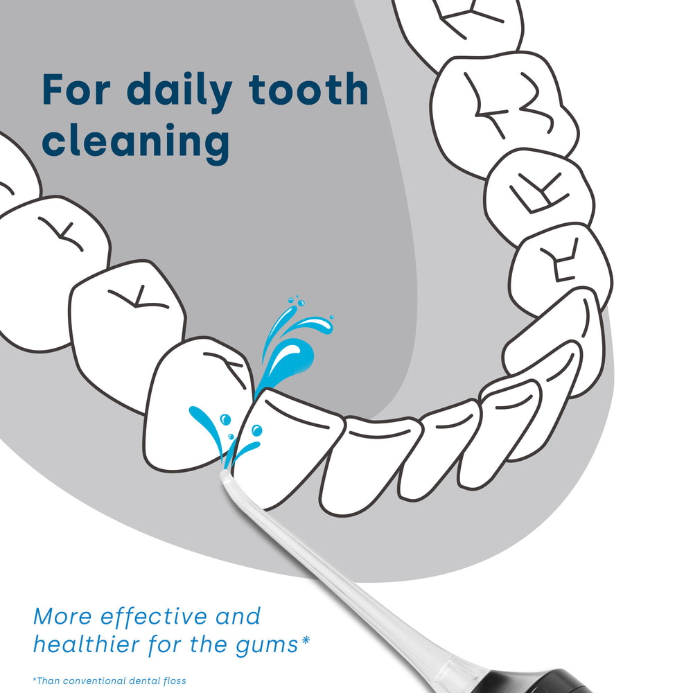 What exactly is an oral irrigator and how does it work? An oral irrigator is an electronic device that uses a targeted jet of water to remove loose particles between the teeth. Unlike dental floss, which can injure the gums if used incorrectly, an oral irrigator allows for gentle cleaning, even in sensitive areas that are difficult to reach. Using dental floss can also be unpleasant, while an oral irrigator is a simple and hygienic alternative. It is an ideal addition to daily oral care and helps effectively to remove deposits and thus prevent the formation of plaque.