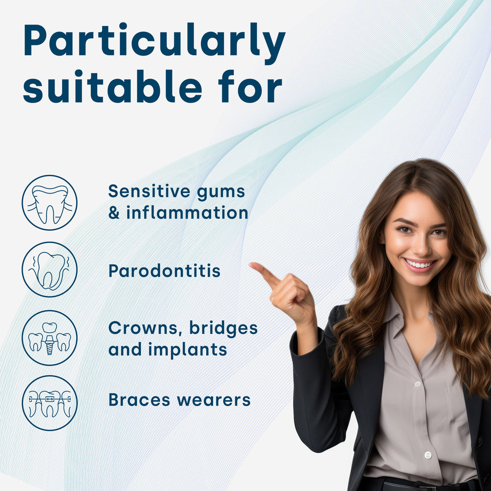 The ultrasonic toothbrush is ideal for braces and implant wearers. It cleans without mechanical movements or scrubbing, effectively cleaning even hard-to-reach areas. If you'd like to learn more, check out our detailed article on cleaning braces, brackets, and implants.
